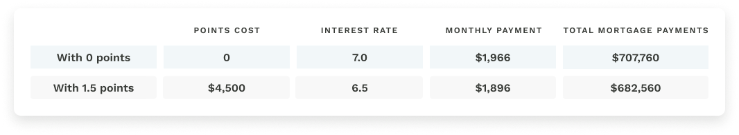 You take out a $300,000 mortgage with an interest rate of 7.0%. The lender offers to drop the interest rate to 6.5% if you buy 1.5 points. The points would therefore cost $4,500 ($300,000 * 1.5 * 1%), which you’d pay to the lender as part of your closing costs.